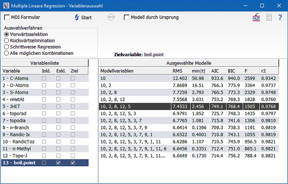 Bei der Erstellung des Modells ist eine der zentralen Fragen, welche der 12 Parameter sind am besten zur Erstellung des Modells geeignet. DataLab bietet zur Auswahl der geeigneten Variablen folgende Methoden an: Vorwärtsselektion, Rückwärtselimination, schrittweise Regression und der Test aller möglichen Variablenkombinationen. Wir rufen dazu den Befehl "Mathematik/Multiple Lineare Regression/Variablenauswahl" auf (oder Knopf