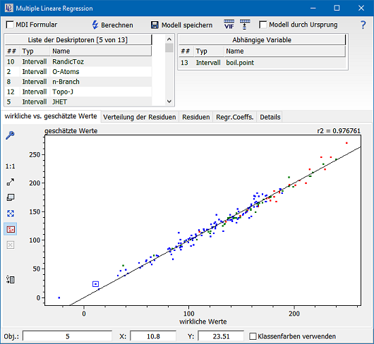 Die Detailergebnisse der multiplen Regression können über das Protokoll (Knopf ============================================================ Multiple Lineare Regression: d:\datalab\data\boilpts.idt ============================================================ Zahl der Objekte ................: 185 Zahl der Eingangsvariablen ......: 5 Zahl der Freiheitsgrade .........: 179 Abhängige Variable ..............: [13] boil.point Mittelwert der Zielwerte ........: 132.714054 Standardabw. der Zielwerte ......: 48.223876 Mittelwert der gesch. Werte .....: 132.714054 Standardabw. der gesch. Werte ...: 47.660251 Standardabw. der Residuen .......: 7.4533 Bestimmtheitsmaß ................: 0.9768 korrigiertes Bestimmtheitsmaß ...: 0.9762 F-Wert ..........................: 1504.731 (p=0.0000) Durbin-Watson Testgröße: 1.27485 kritische Werte (alpha=0.05): DL=1.69295 DU=1.82670 *** Die Residuen sind seriell korreliert. ------------------------------------------------------------ ANOVA DF sum of squares mean square F ------------------------------------------------------------ Regression 5 4.17956E+05 8.35912E+04 1504.731 Residual 179 9.94385E+03 5.55522E+01 Total 184 4.27900E+05 ------------------------------------------------------------ Regressionskoeffizienten: Spalte Var.Name Koeffizient +/- Std.Fehler(Koeff) t-Test alpha ------------------------------------------------------------------------ - INTERCEPT -7.0960574E+01 +/- 5.5103328E+00 -12.878 0.0000 10 RandicToz 7.6873275E+00 +/- 1.1242126E-01 68.380 0.0000 2 O-Atoms -1.3123226E+01 +/- 7.9273468E-01 -16.554 0.0000 8 n-Branch -4.6668763E+00 +/- 1.1711391E+00 -3.985 0.0001 12 Topo-J 7.2078089E+00 +/- 2.3775368E+00 3.032 0.0028 5 JHET -8.5553223E-01 +/- 3.4827518E-01 -2.456 0.0150 |