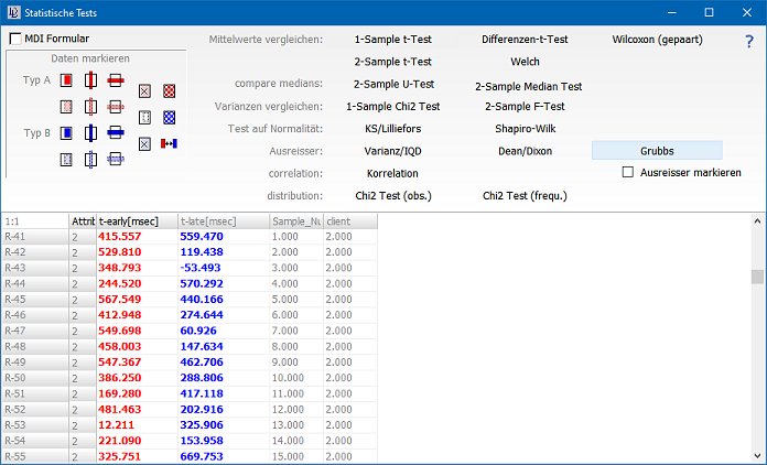 Nehmen wir an, wir hätten zu überprüfen, ob die Teilnehmer eines Trainingscamps unterschiedliche Reaktionszeiten vor und nach dem Training zeigen. Um zu überprüfen, ob es einen signifikanten Unterschied zwischen den beiden Reaktionszeittests gibt, wiederholen wir den Test jeweils einige Male und führen einen t-Test durch. Der t-Test erfordert jedoch dass die Stichproben normalverteilt und die Varianzen gleich sind. Dadurch müssen vor dem eigentlichen t-Test den Shapiro-Wilk-Test zur Überprüfung der Normalverteilung und den Zweistichproben-F-Test zur Überprüfung der Gleicheit der Varianzen durchführen. Alle drei Tests können leicht durch DataLab ausgeführt werden. Wir starten zuerst die statitischen Tests und markieren die Daten, die verglichen werden sollen (rot und blau eingefärbt):