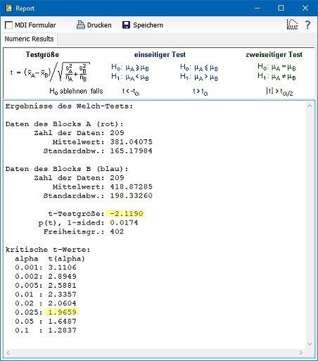Da die Varianzen signifikant voneinander abweichen führen wir schlussendlich einen Welch-Test durch, der auf dem 5%-Niveau signifikant ist. Deshalb können wir annehmen, dass sich die Reaktionszeiten vor und nach dem Training unterscheiden.