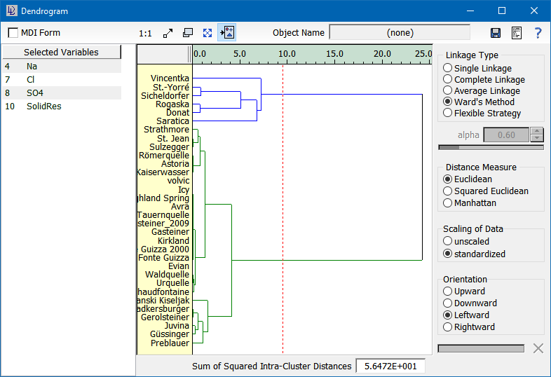 DataLab then calculates the dendrogram, using the currently selected parameters. These include the calculation methods, the distance measure, and the scaling of the data.