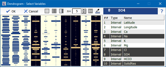Cluster analysis is an efficient tool in order to uncover relationships in multidimensional data spaces. The following example looks for similarities of mineral waters, which have been characterized by their chemical constituents. After starting the cluster analysis, you first have to select the variables which are to be used for the definition of the data space: