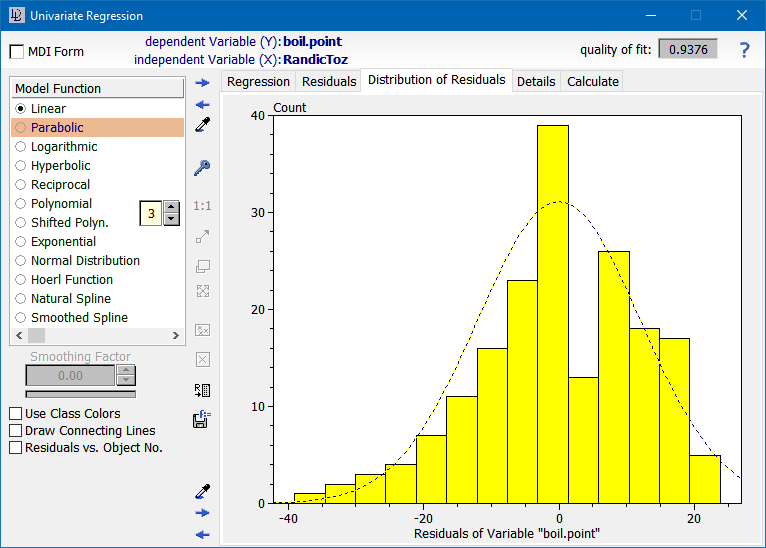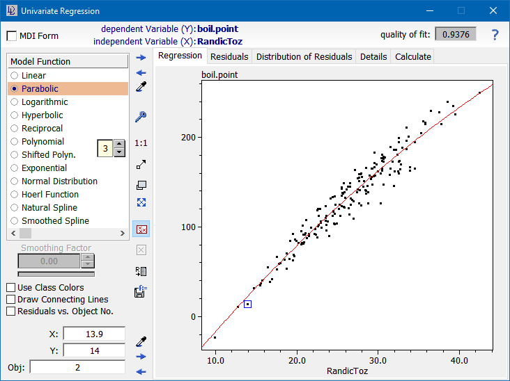 Simple linear regression can be used to set up univariate models. The following plots shows various aspects of the fit of a parabolic curve to the data. The basic plot shows the data and the fitted curve:
