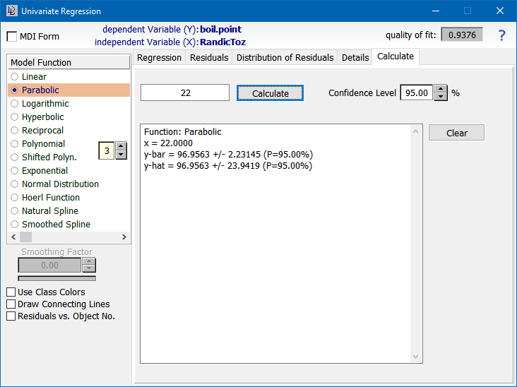 Finally, you may use the fitted curve for estimating y-values at a given x-value. You may set the level of significance for the calculated confidence interval: